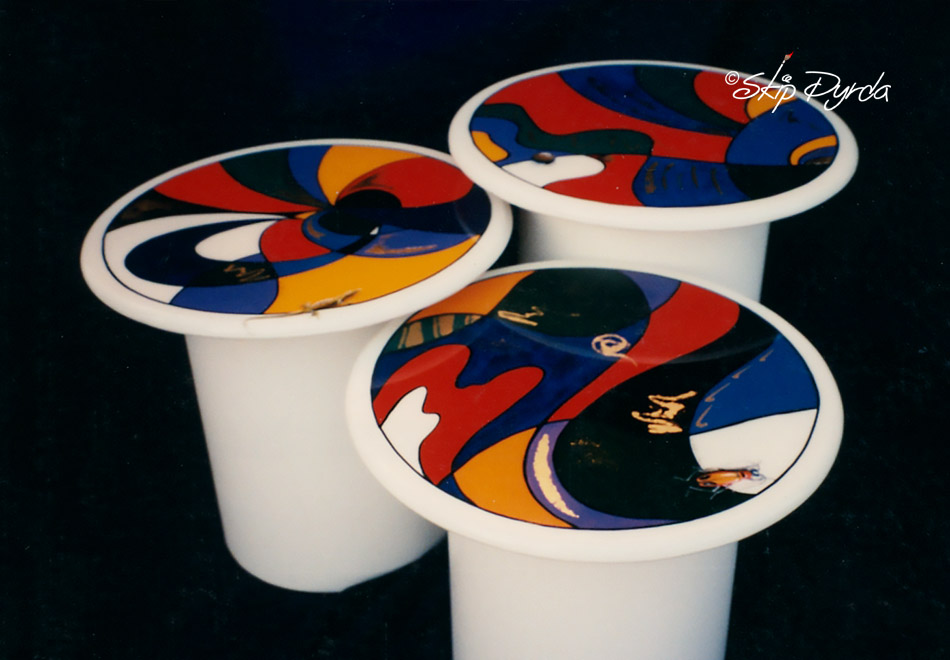 This set of three nesting tables was entirely custom‑built, with tops made from marine‑grade plywood and bases formed from 12‑inch PVC drainage pipe. After priming, sanding, and spraying the surfaces in a clean white finish, I painted contemporary designs on each tabletop, adding a few Trompe L’oeil surprises—a large colorful beetle, a small lizard, and a single marble that appears ready to roll. The finished pieces were sealed with a high‑gloss epoxy coating, giving the artwork depth and durability while unifying the set into a crisp, modern trio.