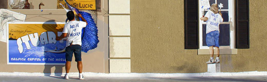 A percent‑for‑art project in Historic Downtown Stuart featuring more than twenty murals painted in custom stucco niches. The large panels highlight key moments in Stuart and Martin County history, while the smaller “windows” include portraits of real people connected to the project and to my life. All were painted with proprietary mineral paints.