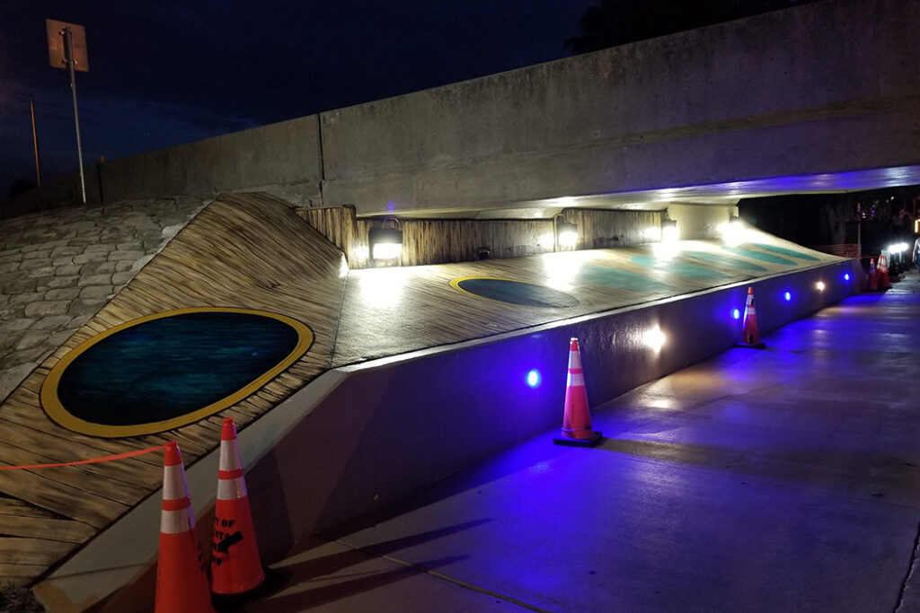 This mural along Punta Gorda’s Harborwalk was one of the most unusual and physically demanding projects I’ve taken on. Painted beneath a bridge where the Peace River meets Charlotte Harbor, the surface included a three‑foot vertical wall and a ten‑foot stretch of cement rising at a steep angle to the underside of the bridge—nearly eighty feet in length. I transformed the entire incline into the illusion of massive, weathered timbers, with several seven‑foot round portholes inset into the “wood.” Each porthole reveals a different species of fish native to Charlotte Harbor. Along the lower wall, I added rectangular portholes and even painted a section of the sidewalk to look like steps leading down to the water. The entire piece was created with high‑quality artist acrylics applied directly to the cement.