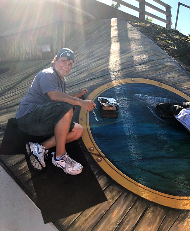 As I was working on the main mural, thousands of people would walk by every week. I got to meet a lot of very nice people. During that time, I had the idea of painting a portion of the sidewalk. This wasn’t anything I was contracted to do and I was under no obligation. I just wanted to do it. I had to receive permission from city council and they agreed. It looks like you can walk down steps to the water.